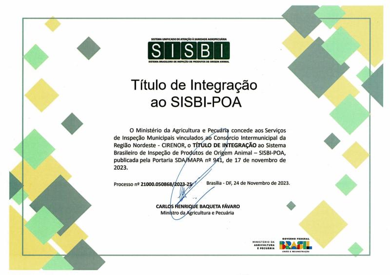 No dia 28 de novembro, com emoção e alegria representantes do CIRENOR participaram de cerimônia realizada pelo Ministério da Agricultura, Pecuária e Abastecimento -MAPA, na cidade de Mirassol d'Oeste, no estado do Mato Grosso com o objetivo de celebrar a adesão de 25 Consórcios ao Sistema Brasileiro de Inspeção de Produtos de Origem Animal - SISBI-POA. Esta conquista foi possível em decorrência de um trabalho realizado desde o ano de 2019 com a participação do Consórcio no Projeto CONSIM, o qual é conduzido pela Secretaria de Defesa Agropecuária. Durante este período o MAPA acompanhou os serviços de inspeção e empreendedores vinculados aos 25 consórcios públicos, incluindo o CIRENOR. Agora, 40 consórcios já aderiram ao SISBI-POA, demonstrando os resultados positivos desse projeto. Com essa conquista, 485 municípios, distribuídos pelos estados da Bahia, Minas Gerais, Mato Grosso, Paraná, Rio de Janeiro, Rio Grande do Sul, Santa Catarina e São Paulo, agora fazem parte do sistema. Esta é a maior inclusão simultânea de entes ao SISBI-POA desde sua implementação, destacando o compromisso do Governo Federal com a segurança sanitária e alimentar da população. O SISBI-POA, integrado ao Sistema Unificado de Atenção à Sanidade Agropecuária (Suasa), padroniza e harmoniza os procedimentos de inspeção de produtos de origem animal, garantindo a inocuidade e segurança alimentar. O reconhecimento da equivalência e adesão ao SISBI-POA exige a comprovação de medidas de inspeção higiênico-sanitária e tecnológica que permitam avaliar a qualidade e inocuidade dos produtos de origem animal com a mesma eficiência do Ministério da Agricultura. Com essa conquista os produtos de origem animal de estabelecimentos incluídos no cadastro do Sisbi- POA poderão ser comercializados em todo território nacional gerando emprego, renda e desenvolvimento a região. Registramos o agradecimento a toda a equipe do CIRENOR, especialmente a Coordenadora do Projeto, Médica Veterinaria, Letícia Felizzari Sganzerlla, ao assessor Jurídico Ilton Nunes e aos Veterinários dos Municípios participantes do projeto, que juntamente com a equipe não mediram esforços para que isso acontecesse. O Consórcio segue na busca constante de melhorias para região gerando desenvolvimento e bons resultados.